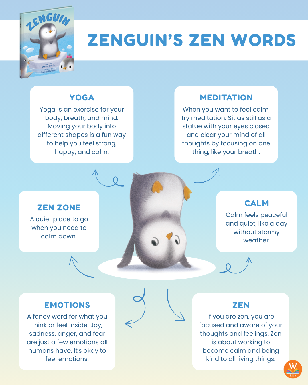 From Bank Street award-winning author Danna Smith and New York Times bestselling illustrator Sydney Hanson comes a sweet and calming picture book that helps instill life skills in young readers with basic, age-appropriate concept learning. Penguin is anxious amidst the hustle and bustle of his busy colony. He wishes to feel calm inside, but he doesn’t know how! Thankfully, a few of his Antarctic friends teach him their strategies for finding inner peace. Before long, Penguin can use his own zen techniques to handle a stressful situation, earning him his new name – Zenguin!